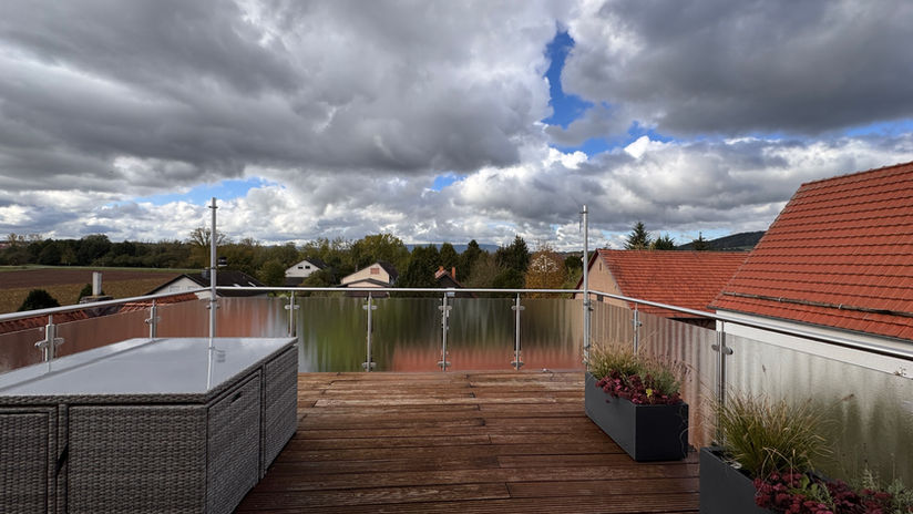 Nach Ihren Erlebnissen könnt Sie in der modern und gemütlich eingerichteten Fewo mit großer Dachterrasse den Sonnenuntergang genießen. Dort steht ein Tisch mit 4 Stühlen, zwei Relaxliegen sowie ein Elektrogrill zur Verfügung.